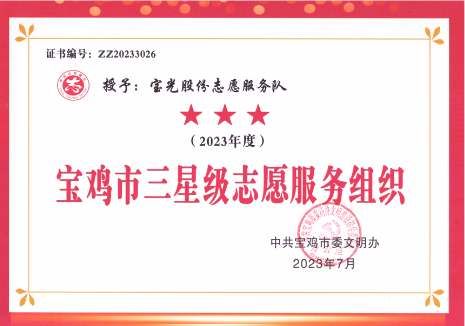 日前,寶光股份志愿服務(wù)隊(duì)被中共寶雞市委文明辦評(píng)為“寶雞市三星級(jí)志愿服務(wù)組織”。