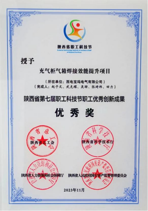陜西省職工優(yōu)秀創(chuàng)新成果優(yōu)秀獎——西電寶雞電氣“充氣柜氣箱焊接效能提升項目”