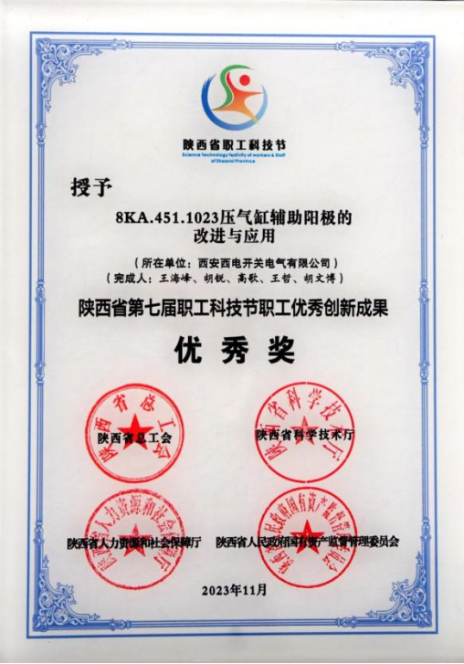 陜西省職工優(yōu)秀創(chuàng)新成果優(yōu)秀獎——西開電氣“8KA.451.1023壓氣缸輔助陽極的改進(jìn)與應(yīng)用”