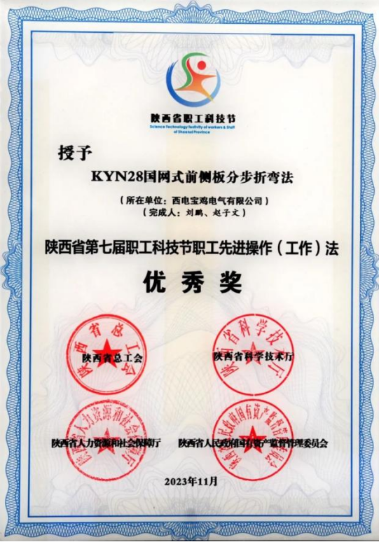 陜西省職工先進(jìn)操作(工作)法優(yōu)秀獎——西電寶雞電氣“KYN28國網(wǎng)式前側(cè)板分步折彎法”