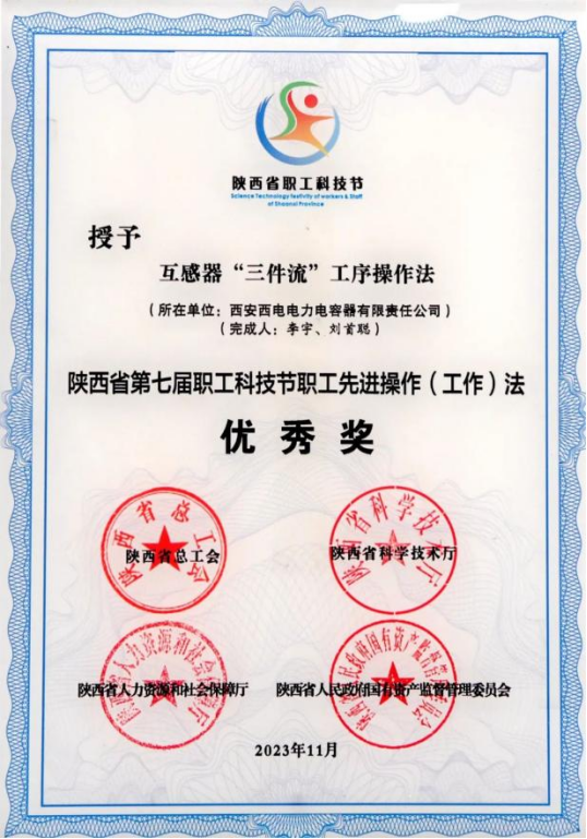 陜西省職工先進(jìn)操作(工作)法優(yōu)秀獎——西電西容“互感器'三件流'工序操作法”