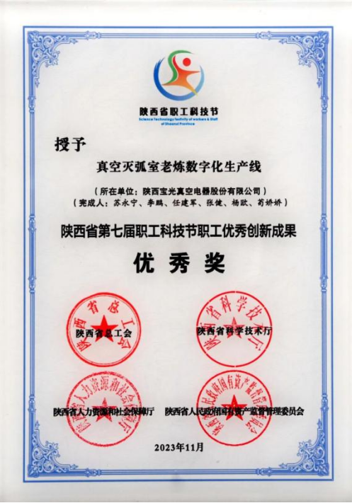 陜西省職工優(yōu)秀創(chuàng)新成果優(yōu)秀獎——寶光股份 “真空滅弧室老煉數(shù)字化生產(chǎn)線”