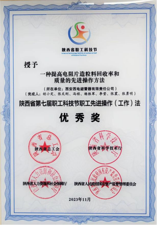 陜西省職工先進(jìn)操作(工作)法優(yōu)秀獎——西電避雷器“一種提高電阻片造粒料回收率和質(zhì)量的先進(jìn)操作方法”