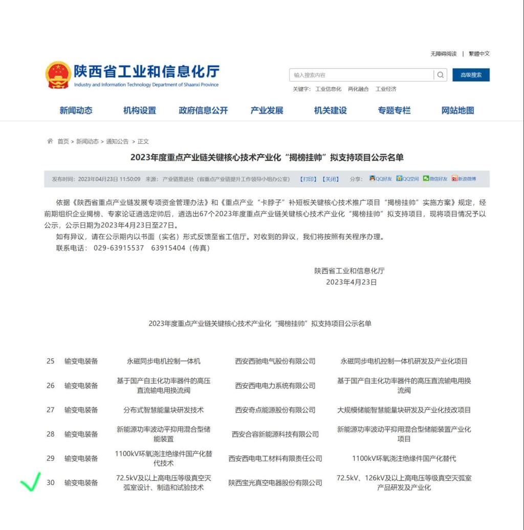 通過認(rèn)真籌備、資料審核及現(xiàn)場答辯,由公司組織申報(bào)的“72.5kV、126kV及以上高電壓等級真空滅弧室產(chǎn)品研發(fā)及產(chǎn)業(yè)化”項(xiàng)目與“高鐵車載開關(guān)用真空滅弧室智能化產(chǎn)線建設(shè)”項(xiàng)目分別中榜陜西省工信廳2023年關(guān)鍵核心技術(shù)產(chǎn)業(yè)化“揭榜掛帥”項(xiàng)目與重點(diǎn)產(chǎn)業(yè)鏈發(fā)展項(xiàng)目,并已進(jìn)入公示階段。
