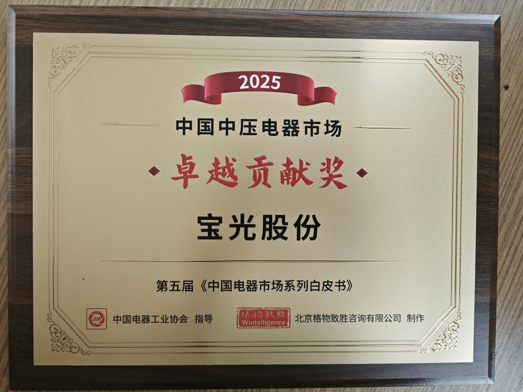 近日,由中國(guó)電器工業(yè)協(xié)會(huì)指導(dǎo),中電協(xié)理事單位主辦的《2025年中國(guó)電器市場(chǎng)系列白皮書(shū)》發(fā)布會(huì)在上海隆重舉行。會(huì)議表彰在市場(chǎng)占有率、增長(zhǎng)率和產(chǎn)品創(chuàng)新等方面取得成績(jī)的優(yōu)秀電器企業(yè),寶光股份應(yīng)邀參會(huì),榮獲2025年度中國(guó)中壓電器市場(chǎng)“卓越貢獻(xiàn)獎(jiǎng)”和“銷(xiāo)量領(lǐng)先獎(jiǎng)”。